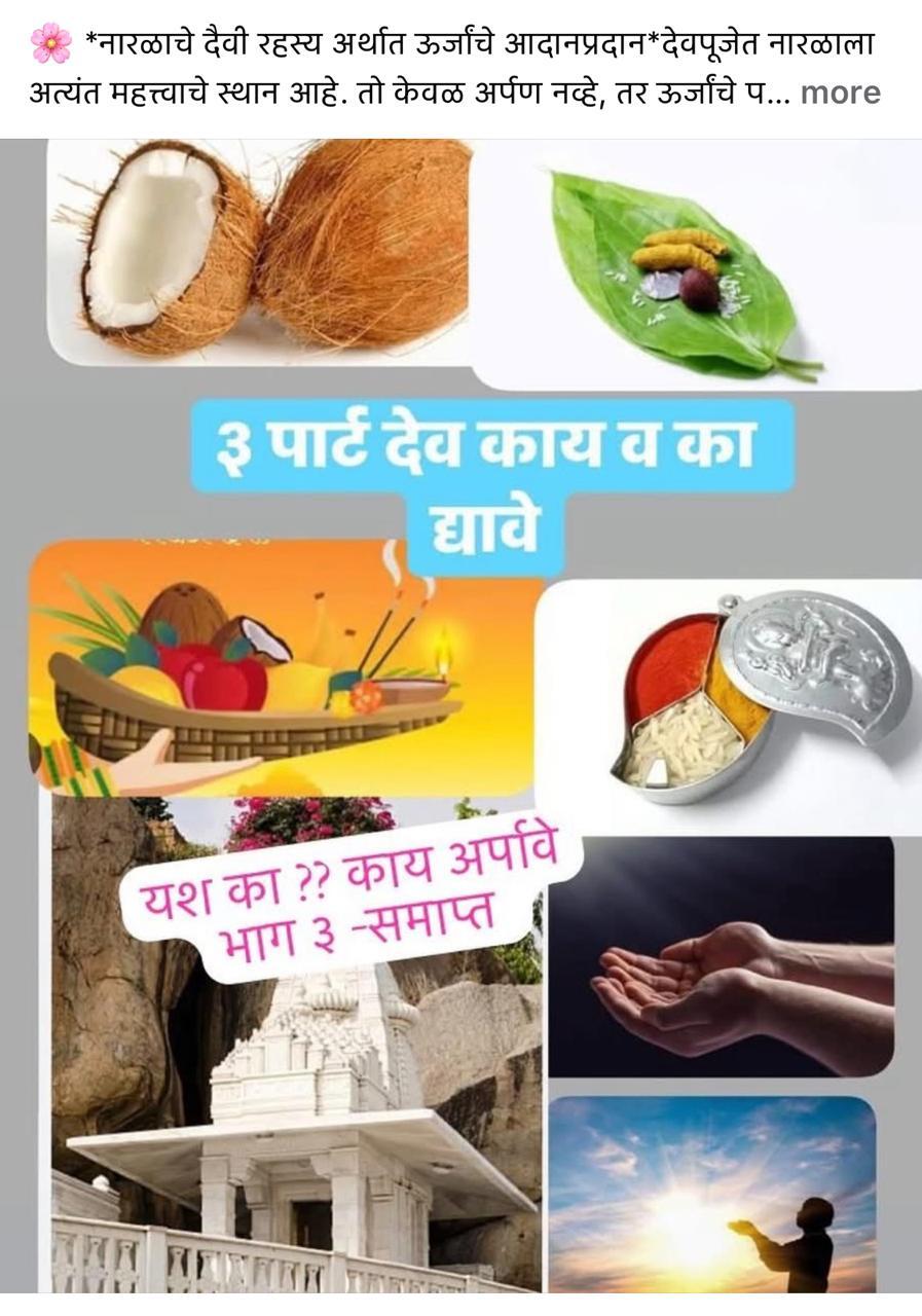 🌼 नारळ अर्पण म्हणजे ऊर्जांचे आदानप्रदान -आदराने एखाद्या परमपूजनीय व्यक्तीस किंवा देवास नारळ अर्पण करणे म्हणजे शुभ ऊर्जा देणे आणि घेणे.-अर्पण केलेल्या नारळातून देवाची कृपा, तर आपली नकारात्मकता देवमय ऊर्जा शोषून घेते.